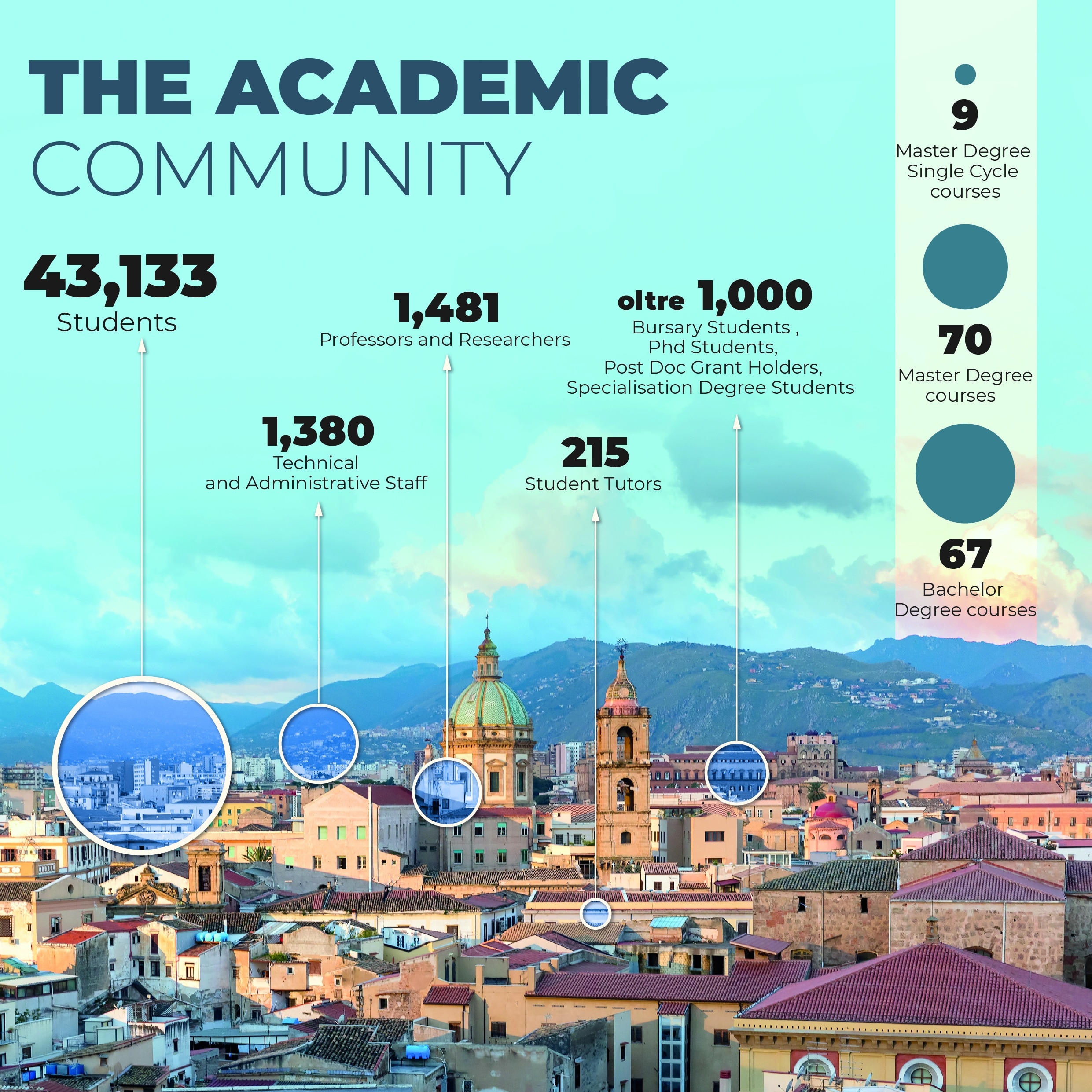 Founded in 1806 by Ferdinand III, of the Bourbon royal family which ruled over the Kingdom of Naples and the Two Sicilies, who made Accademia Panormitana degli Studi a University, now UniPa, ours is a huge campus with a vocation evenly divided up between teaching, research and third mission. The current educational programme consists of 146 courses of study ranging from undergraduate Degrees to Single Cycle Master Degrees and specialisation Degrees, 31 specialisation schools and 21 research doctorates.